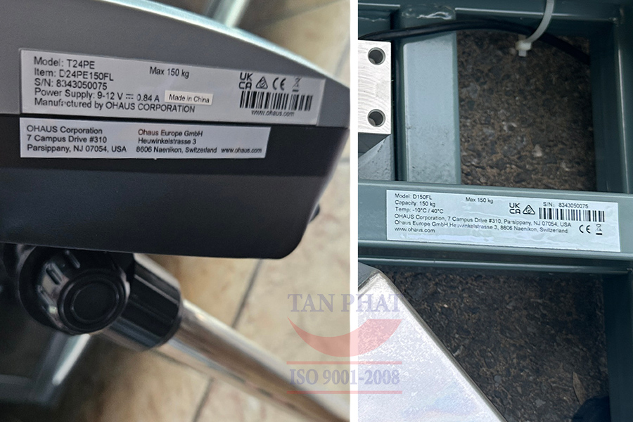 Lưu ý: Cân bàn điện tử OHAUS D24PE150FL nhập khẩu nguyên bộ chính hãng thì S/N (Serial Number) trên đầu cân và khung bàn cân sẽ phải trùng khớp với nhau. Ngoài ra thì phần tem mác trên sản phẩm cũng thể hiện rõ model và các thông số cơ bản của cân.