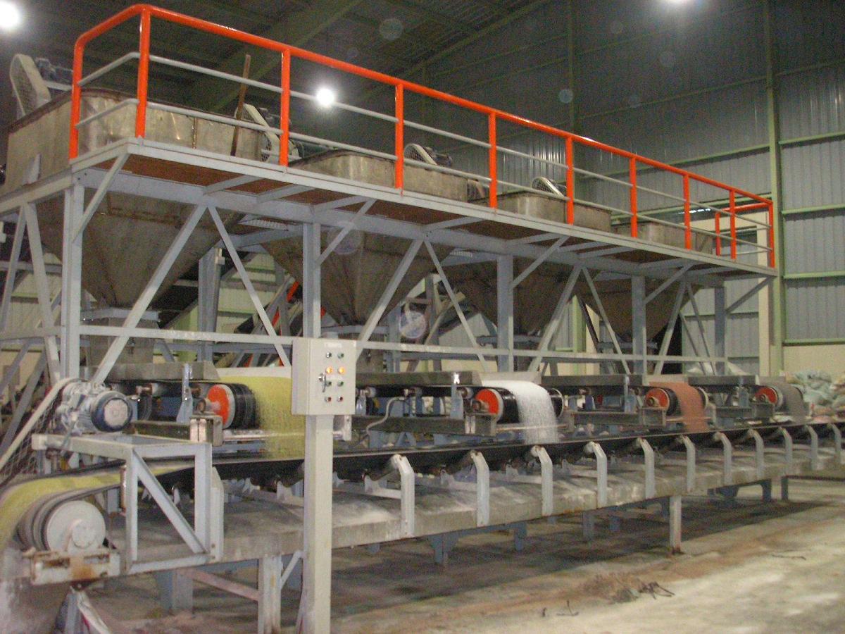 Dây chuyền sản xuất trong nhà máy thạch cao, với hệ thống định lương nguyên liệu 6 thành phần.