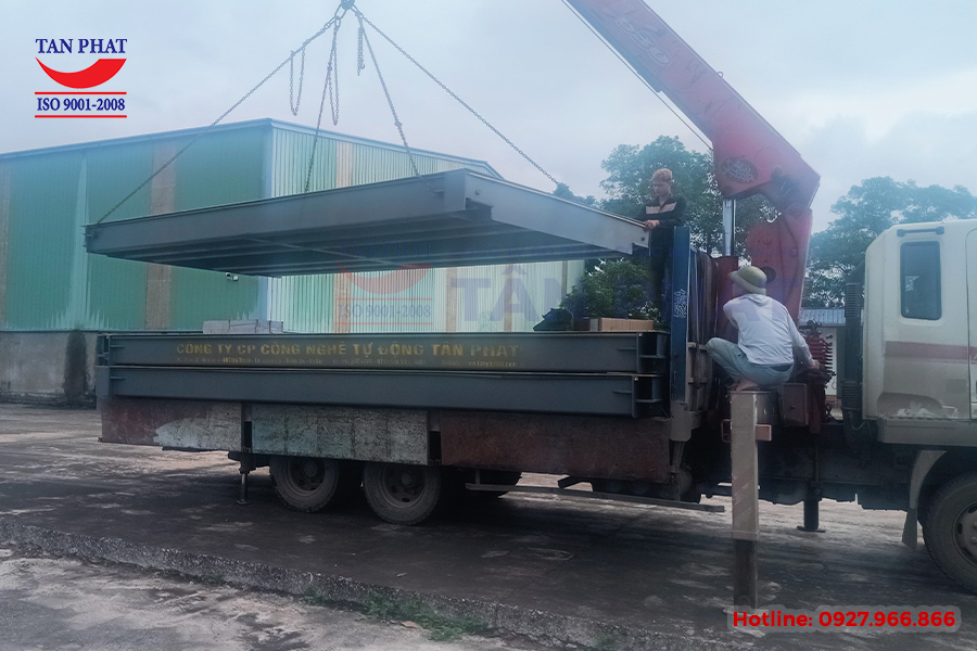 Cẩu vận chuyển hỗ trợ hạ từng module cân cùng thiết bị cân xuống vị trí lắp đặt bàn cân.