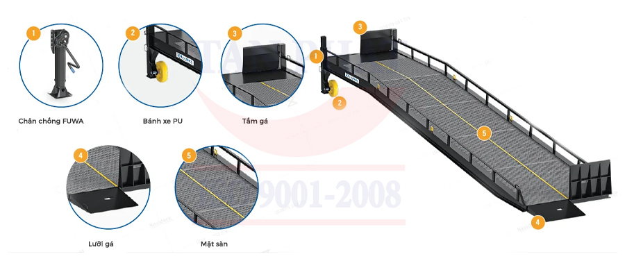 Cấu tạo hoàn toàn từ sắt thép, di chuyển bằng hệ thống bánh xe và thay đổi chiều cao dễ dang nhờ chân chống rơ mooc hiện đại, cầu công 6 tấn có thể làm việc với nhiều dòng xe vận chuyển chuyên dụng hiện nay.