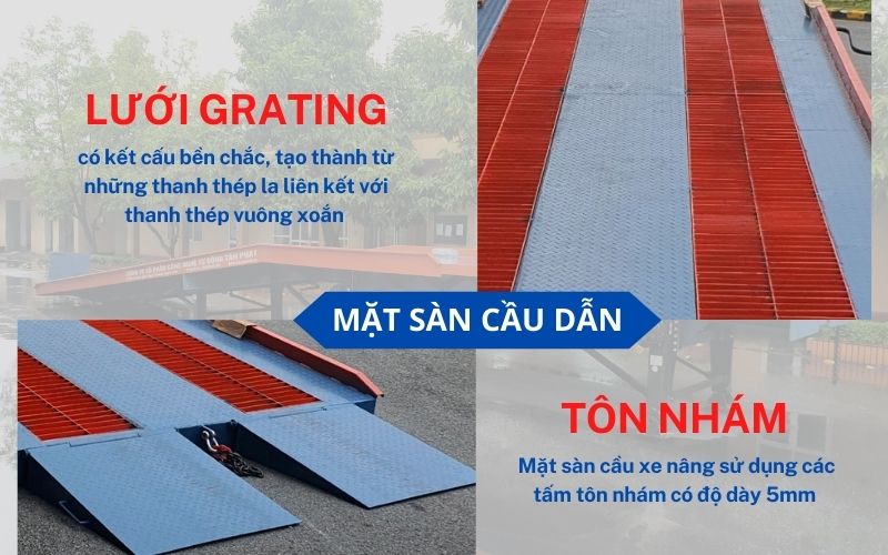 Mặt sàn sử dụng tôn nhám kết hợp lưới thép grating, tạo nên kết cấu vững chắc với khả năng chịu lực lớn. Ngoài ra còn bảo vệ độ bền và giảm tình trạng hao mòn hưu hỏng lốp xe nâng xe điện khi di chuyển trên mặt cầu container thường xuyên.