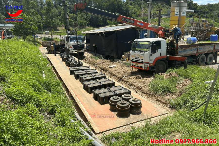 Hiệu chỉnh bằng quả chuẩn: Xe tải chở quả tải chuẩn theo quy định đến vị trí cân, cẩu quả chuẩn lên cân.