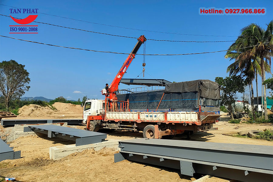 Cân ô tô 120 tấn có 3 module được vận chuyển đến vị trí móng cân để tiến hành lắp đặt trạm cân.