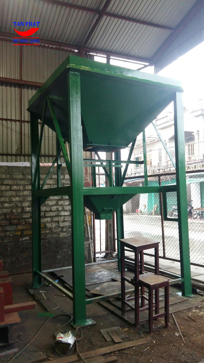 Phần khung của cân đóng bao đang trong quá trình sản xuất, chưa được lắp đặt phễu cân nguyên liệu hạt ngô.