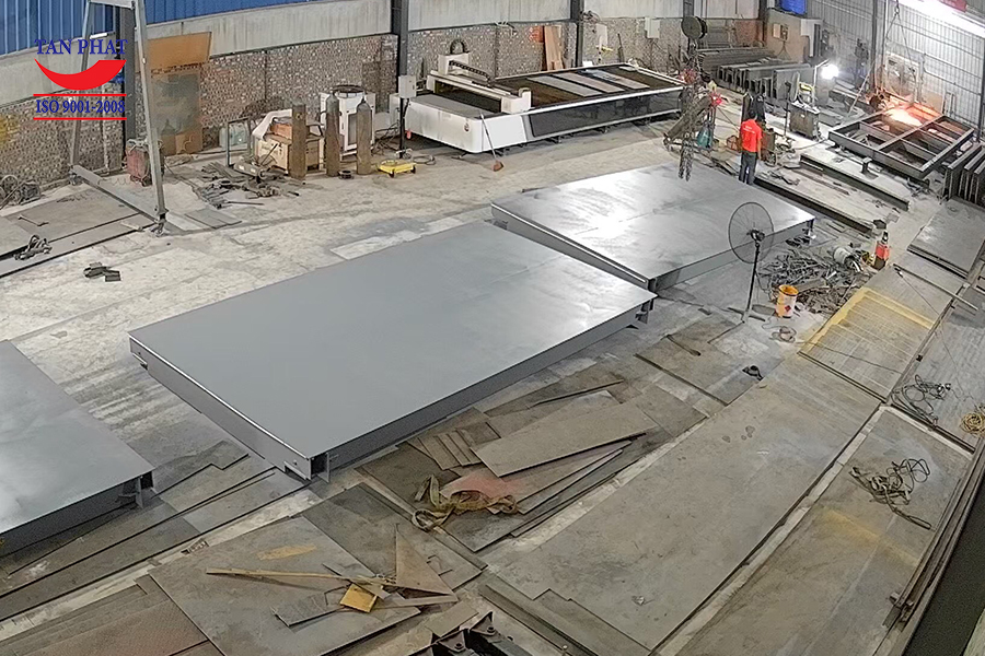 - Mặt sàn cân làm bằng tôn trơn dày 10mm đảm bảo khả năng chịu tải trọng cao, tối đa đến 100.000kg